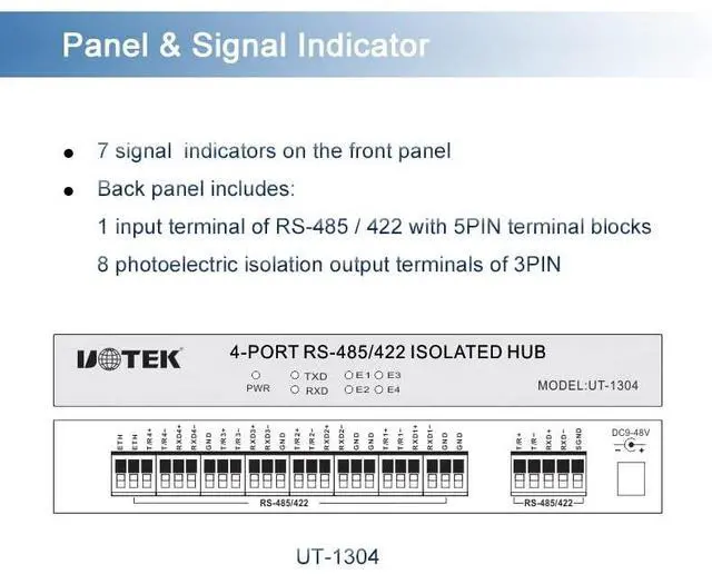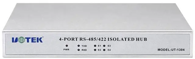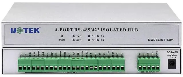 • UT-1304 is a bus-splitting hub designed with an internal microprocessor (uninterrupted operation) to meet the requirements of RS-485/422 systems in complex electromagnetic fields.