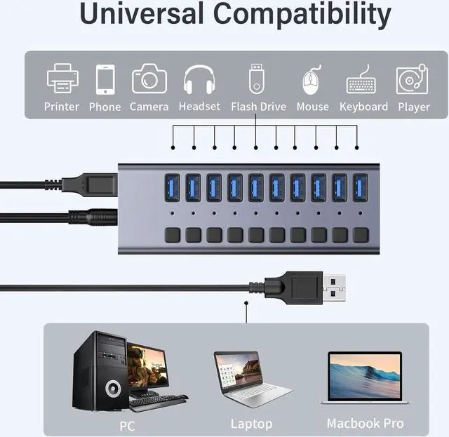 Wide compatibility: 10 port multi usb port powered hub is compatible with most operating systems: Windows XP/Vista/7/8/10, MacOS-8/9/X, UNIX, Linux and offers fast PLUG-AND-PLAY installation.