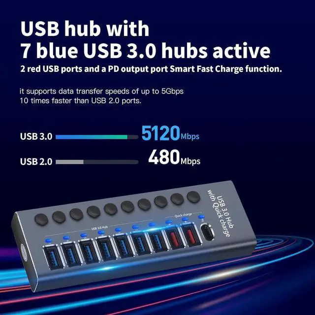 10 Port USB HUB with USB hub has 7 blue USB 3.0 hub activities, 2 red USB ports and 1 PD output interface with smart fast charging function. Two red smart fast-charging ports can automatically detect your device's fast-charging protocol and charge your phone to over 50% in 30 minutes at speeds of up to 1 to 2.4 amps.