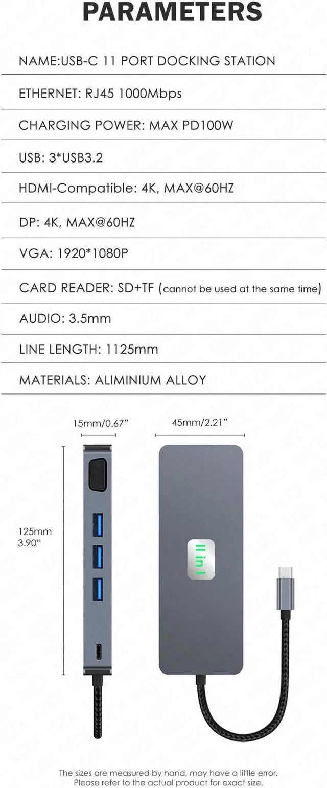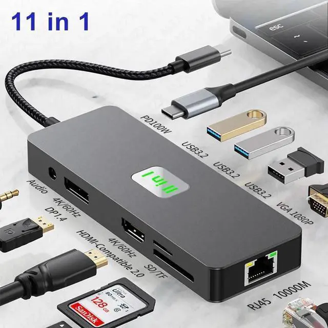 11-in-1 Docking Station:USB-C 11 in 1 hub is made of thin and sleek precision milled aircraft grade aluminum enclosure, having a faster heat dissipation and more stable performance.11 in 1 Dongle Docking Station including 4K60Hz HDMI, 4K60Hz DisplayPort, 1080P VGA, Ethernet 1Gbps, 100W PD, 3*10Gbps USB 3.2, Audio and SD/TF