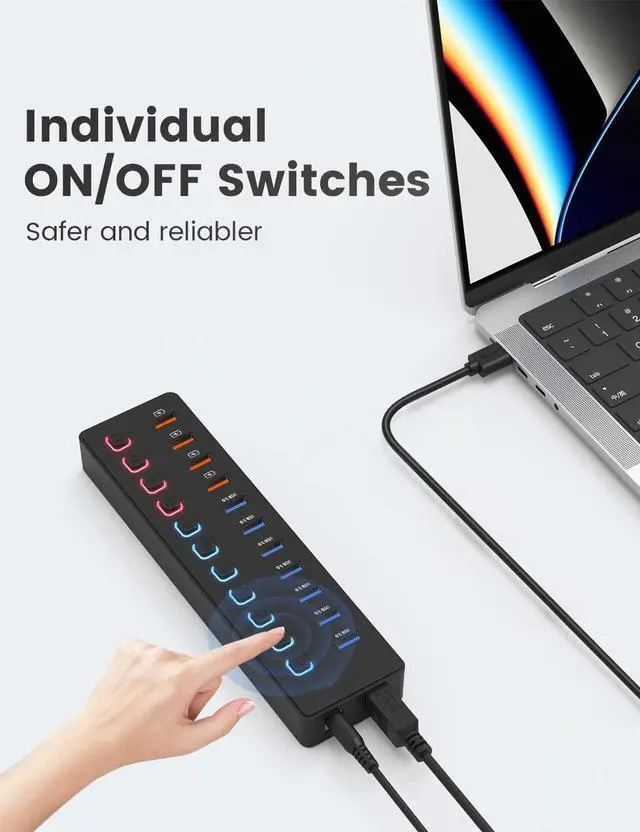 Powered USB Hub 3.0, 11-Port USB Data Hub Splitter (7 Faster Data Transfer Ports+ 4 Smart Charging Port), Individual On/Off Switches and 12V Power Adapter USB Extension for MacBook, Mac, PC, Laptops