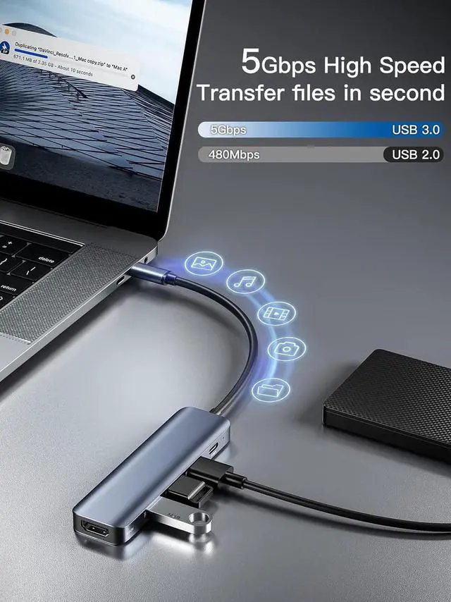5-in-1 USB C Hub: This USB C Splitter 1 to 5 features 1*4K HDMI port, 3 *USB 3.0 port and 1*100W PD charging port. This USB C splitter almost meets all daily work needs, efficient and convenient, plug and play, without the need to install any drivers.