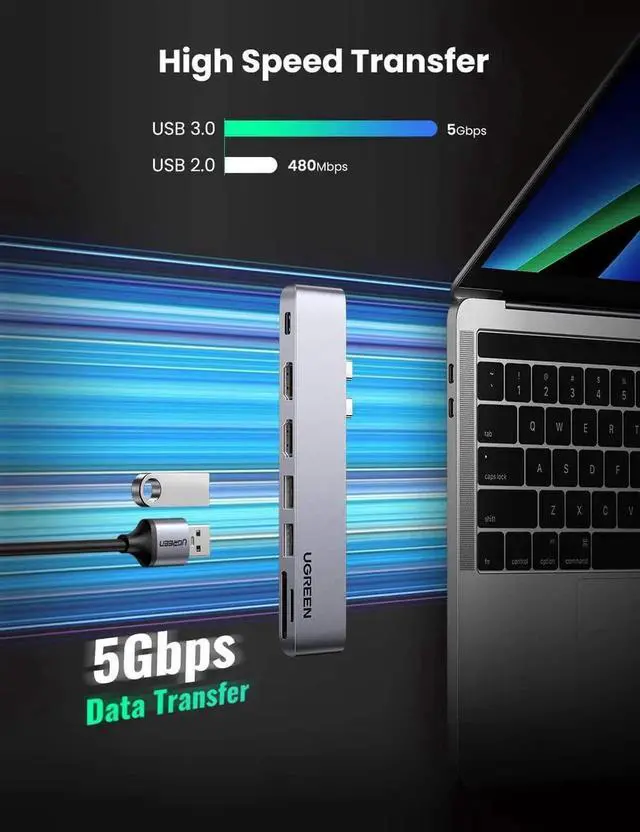 High-Speed Data Transfer: This USB C adapter enabled 2* USB 3. 0 Ports that support data transfer speed up to 5Gbps, allowing you to connect a keyboard, mouse, USB driver, external disk to MacBook Pro. Compatible with USB 2.0. The UGREEN USB C Multi-Card Reader Built-in SD and TF slots for easy access to files from universal SD and Micro SD Memory Card simultaneously, Ideal tool for photographer or designer.