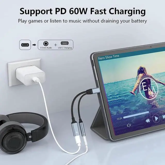 PD 60W fast USB C chargingThis USB C 3.5 mm AUX audio adapter has a type-c fast charging port, the type c to 3.5 mm audio adapter supports PD fast charging up to 60W, and the maximum output power is 20V/3A. Listening while charging.