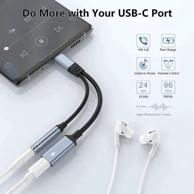 2 in 1 USB C to 3.5 mm Headphone adapterWith the USB C to 3.5 mm audio headphone charger adapteryou can listen to your music while charging your phone, This multiple functionality USB Type-C to 3.5 mm adapter supports music playback and calling for most USB C devices, And supports volume control while fast-charging your device.