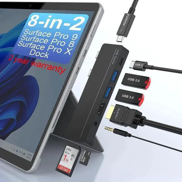 8-in-2 Specially designed for Pro 9/Pro 8/Pro XSpecifically developed for Microsoft Surface Pro 9, Microsoft Surface Pro 8 and Surface Pro X, Surface pro 8 hub turns the 2 USB-C connection into 8 ports (2 X USB 3.0 port, 1X 4K HDMI port, 1X 100W Thunerbolt 4 port (Display+Data+PD Charging), Type-C (5Gbps data), 1X SD/TF (Micro SD) slot, 3.5 mm