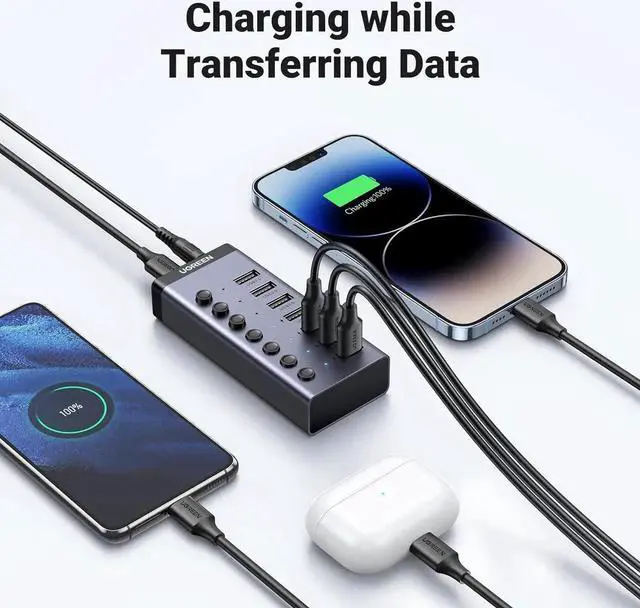 • 4 Smart Charging Ports: There are 4 USB ports of the UGREEN USB 3.0 Charging hub support charging for other devices like smartphones, tablets, earphone, USB fans, and more. The most important thing is that it could automatically detect your device's charging protocols to deliver the optimum charge, and protect the battery of your device from damage.
