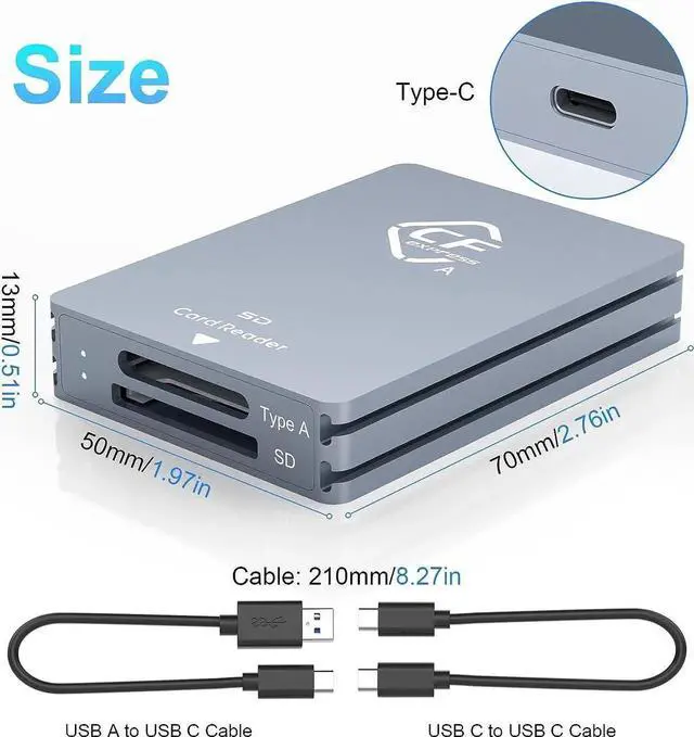 What You Will Get1 x CFexpress Type A & SD 3.0 Card Reader, 1 x USB-C TO C Cable, 1 x USB-C TO A Cable, 1 x User Manual, 1-year and friendly customer service. Please feel free to contact us at any time.
