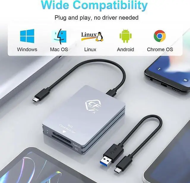 Board CompatibilityCompatible with most systems such as Windows XP/Vista/7/8/ 8.1 /10/11, Mac OS, Linux, Chrome OS, Android. Also this CFexpress card reader is compatible with most devices--not only USB type C device but also USB A device.
