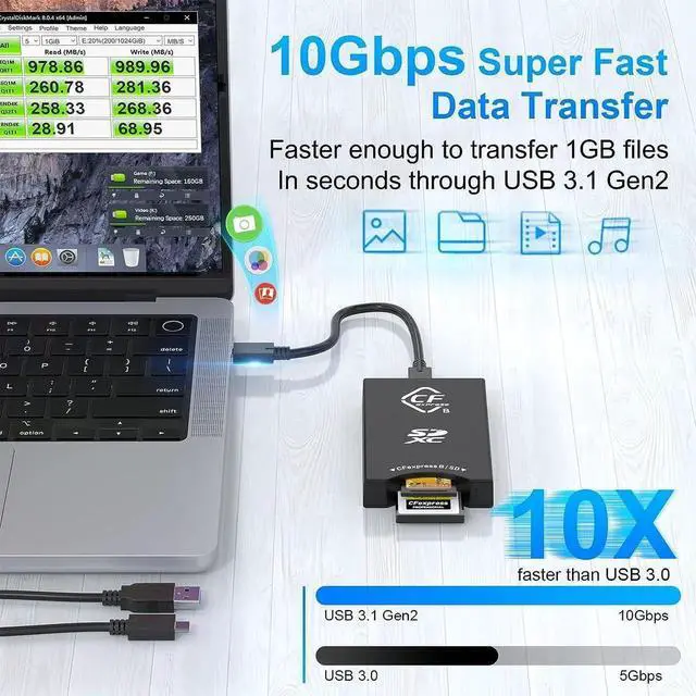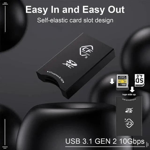 Read Professional CFexpress Type B/SD Cards SimultaneouslyUSB 3.2 Gen 2 CFexpress Type B and SD memory reader transfers your data at lightning speed - up to 1.25GB /s (10Gb/s) from both cards simultaneously. Transfer your masterpieces to your laptop in just a few seconds, CF express cards type b reader no need to wait for a long time