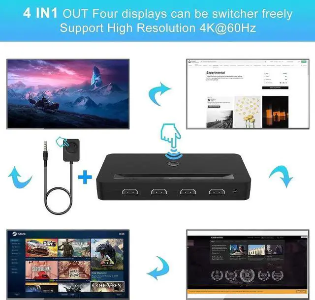 4K KVM Switch HDMI 4 PortThis hdmi and usb switch can switch 4 computers with only 1 (monitor, keyboard, mouse), you can control four computers on one monitor, hdmi usb switch allows your Cleaner desktops and more efficient work.