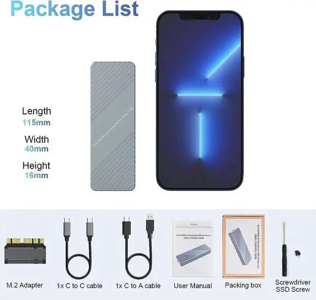 What You Will Get: 1*USB 3.2 Gen 2 m. 2 ssd enclosure, 1*USB C to USB C Cable, 1*USB C to USB A Cable, 1*SSD Screw, 4*SSD Case Screw, 1*Screwdriver, 1*m. 2 Adapte