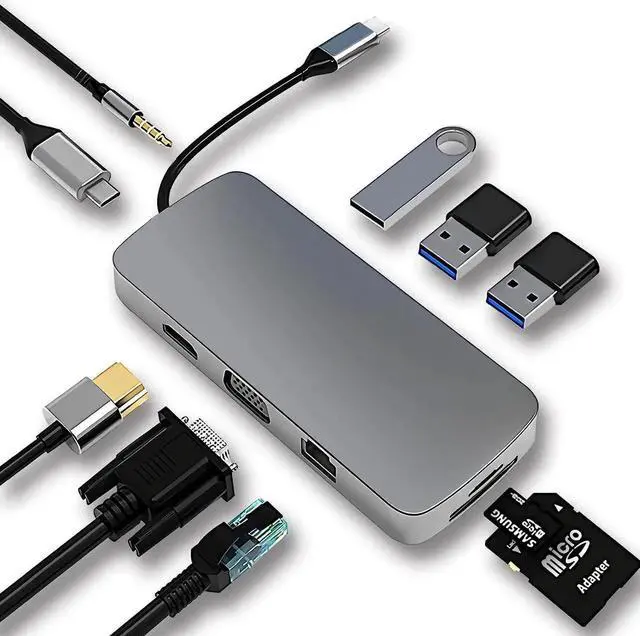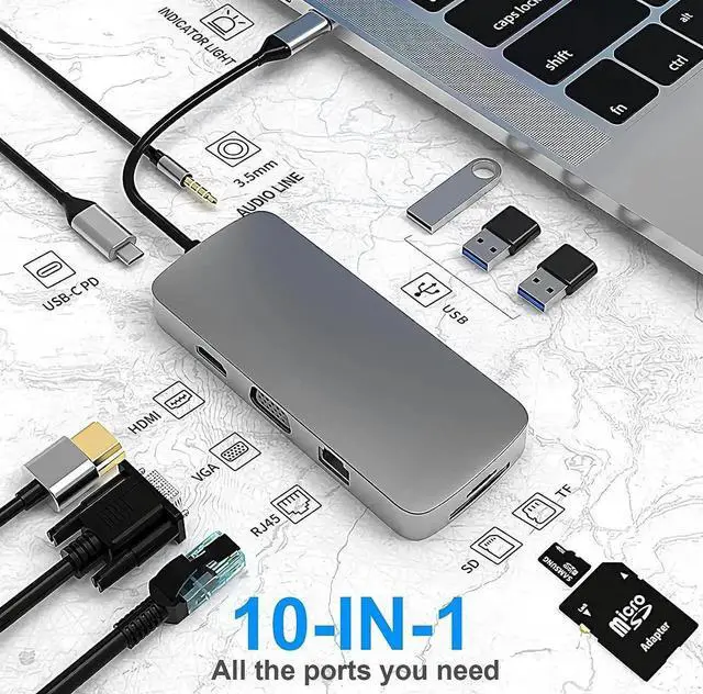 IN 1: The USB-C hub adapter is compatible with all devices that contain Type-C/USB ports, especially for MacBook Pro and Air. 10-in-1 USB-C HUB includes one USB 3.0 and two USB 2.0 ports, one PD port, one 4K HDMI video output, one VGA male-to-female port, one RJ45 100M Ethernet interface and one audio output, and SD/Micro SD card reader slots, compatible with MacBook Pro/Air, Chromebook and more Type-C devices.