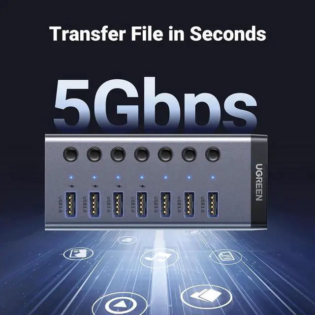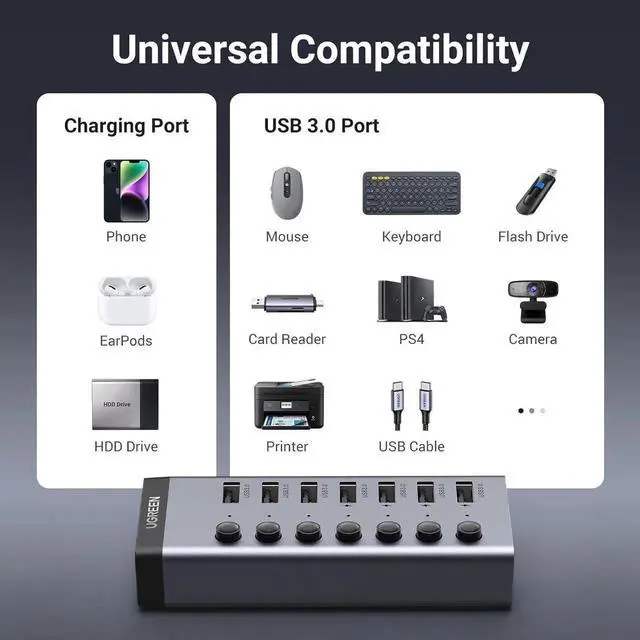 Individual Switch & Led Light: This UGREEN USB 3.0 expander Hub is equipped with individual switches and LED indicators for each USB port. Lets you turn each device on and off individually at any time, and know the working status of the USB ports.