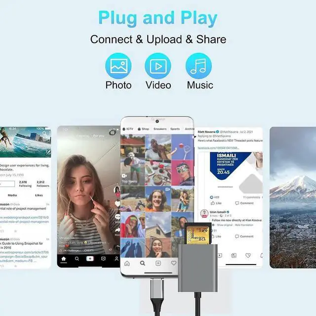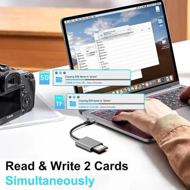 Simultaneously Reading&Writing TF&SD cardsThis USB C SD UHS-II card reader Supports reading and writing two cards simultaneously. You can easily review files or back up and archive photos and videos in USH-II USH-I SD, SDHC, SDXC, Micro SD, Micro SDHC, Micro SDXC, MMC RS-MMC TF cards. No need to constantly unplug and re-plugging.