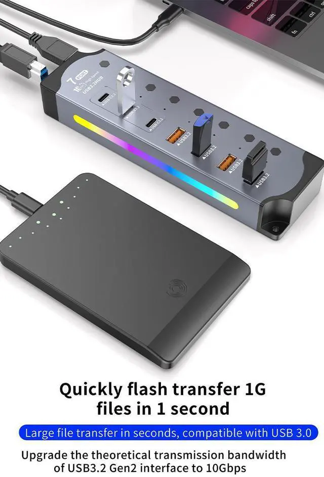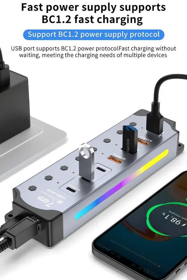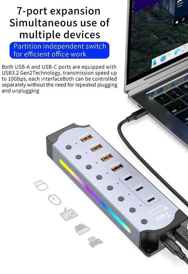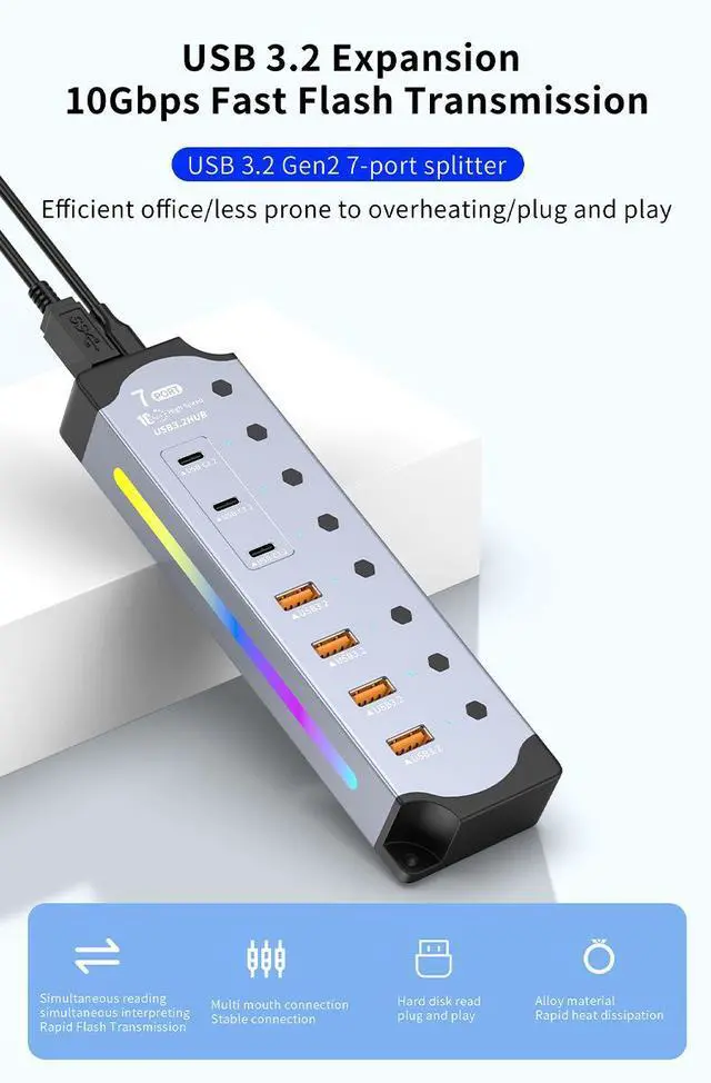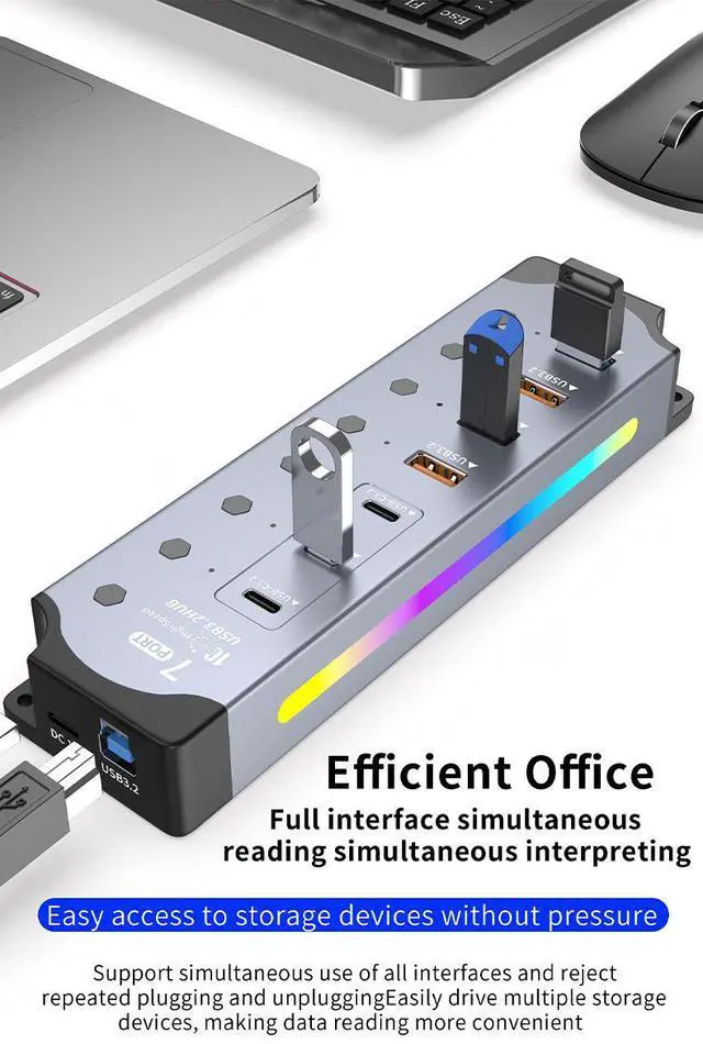 Customizable RGB Gaming LightingFeaturing 14 dynamic RGB lighting modes, this hub elevates your gaming setup. The aluminum body not only provides excellent heat dissipation but also serves as a canvas for vibrant RGB effects that can be synced with your other gaming gear.