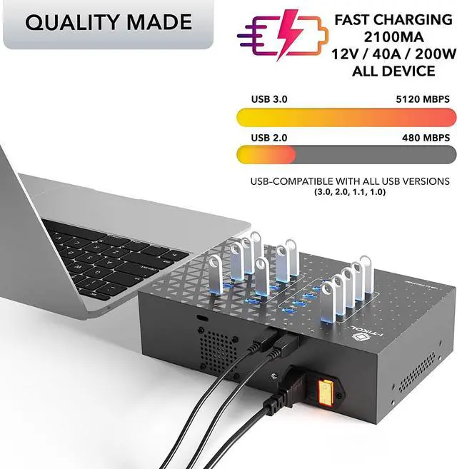FAST USB 3.0 HUB - Box Shaped 20 Port USB 3 Hub Charger and Data Transfer has a Speed of Up to 5Gbps. The Power above and all 20 Ports give 2100mA at the same Time, allowing this Hub to charge a large Number of Devices simultaneously, without the loss of Speed and Power.