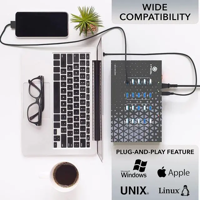 FOR VARIOUS OPERATING SYSTEM our USB 3 Hub has a Multi Compatible Operating System. You can use this USB Port Hub with Windows XP/Vista/7/8/10, MacOS-8/9/X, UNIX, and Linux. This Multi USB Port does not require any additional Software. Just simply plug the Multiport USB Charging Station into a Power Outlet and your Device, and you can start using the 20 Port Splitter with its Plug-and-Play Feature right away. The Hub is compatible with all USB Versions ( 3.0, 2.0, 1.1, and 1.0 ).