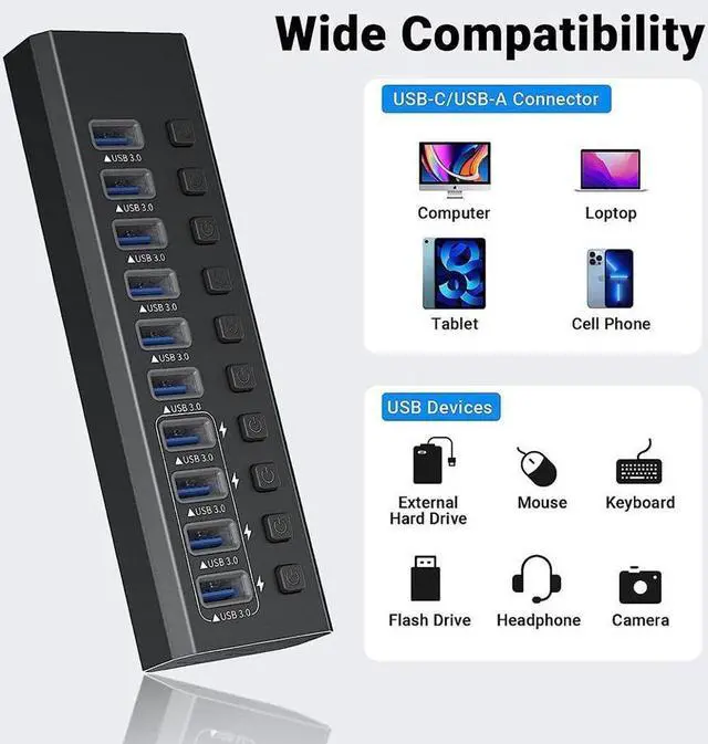 - Share the same powered USB hub with your family and friends, this USB hub 3.0 powered can support 7 devices at the same time.
