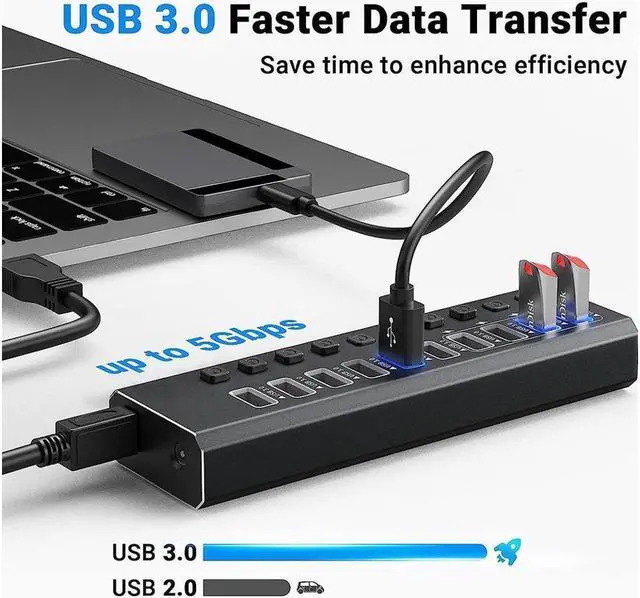 - 10 in 1 multi-port expansion hub, easily expand 1 port on your laptop/desktop to 10 USB 3. 0 data ports and 4 fast charging ports. USB 3.0 hub data transfer rate up to 5Gps, saving you a lot of time.