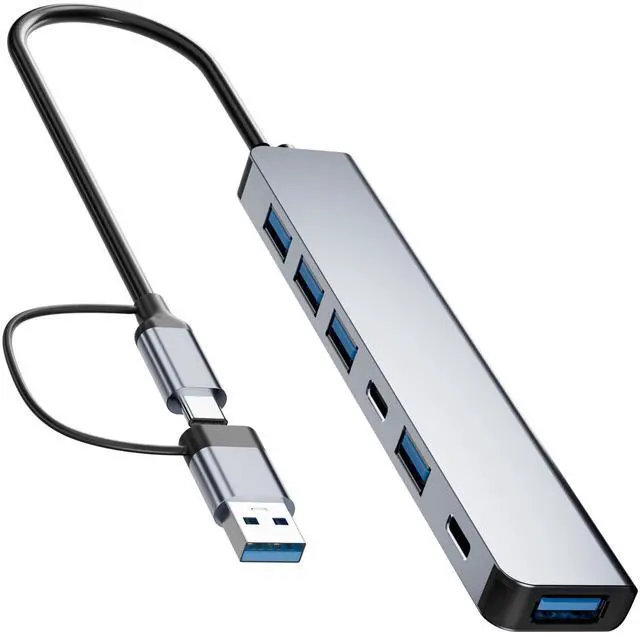 This 7-in-1 USB C/USB hub is made of high-quality aluminum alloy shell, which is durable and has a good hand feeling. It is equipped with multiple interfaces, including 2* USB-C and 5* USB, which can meet the needs of different devices. The USB C port supports data transfer speeds of up to 5Gbps and 100W power output, while the USB ports support data transfer speeds of up to 5Gbps . The hub is compatible with a wide range of devices, including laptops, Macbooks, tablets, smartphones, PS4, Xbox, printers, mice, keyboards, and more. It is also compatible with the latest Macbook Pro, iPad Pro, and other USB-C devices. The hub is slim and portable, with a length of only 5.9cm, making it easy to carry and use. It is also compatible with USB 3.0, USB 2.0, and USB 1.1, providing fast data transfer speeds and reliable performance.