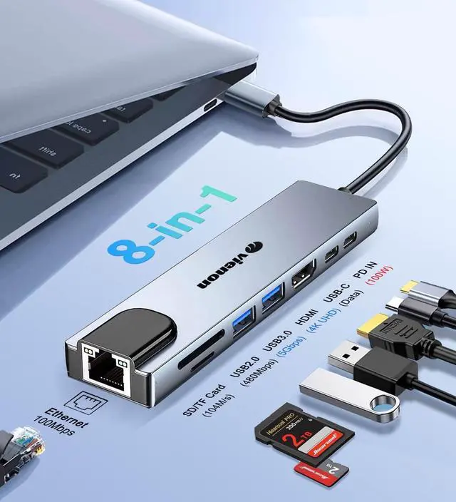 8 in 1 USB C Hub Multiport Adapter, USB C to HDMI Adapter, USB C to Ethernet Adapter, USB C to SD/Micro SD Memory Card Reader with USB 3.0/2.0, PD 100W Fast Charging Port, LAN USB C Docking Station USB Extender for Laptop, Macbook Air/Pro, Chromebook, XPS, HP and More Type C Devices