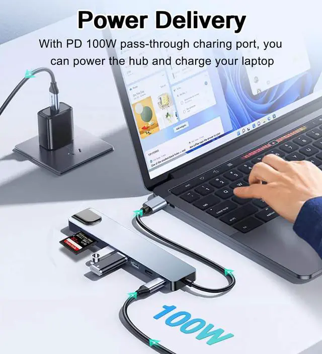 - [Fast Power Delivery&Data Transfer]: Euiped a USB C charging port with 100W power delivery, (note: data transfer not supported), which can charge a MacBook Pro 60% in 35mins; 1* USB C 3.0 por & 1*USB A 3.0 port: Data transfer speed up to 5Gbps; 1*USB2.0 Port: speed up to 480Mbps, perfect for your keyboard, Mouse, U flash driver, SSD, HDD, Printer and more USB peripheral devices.