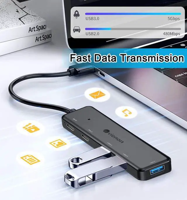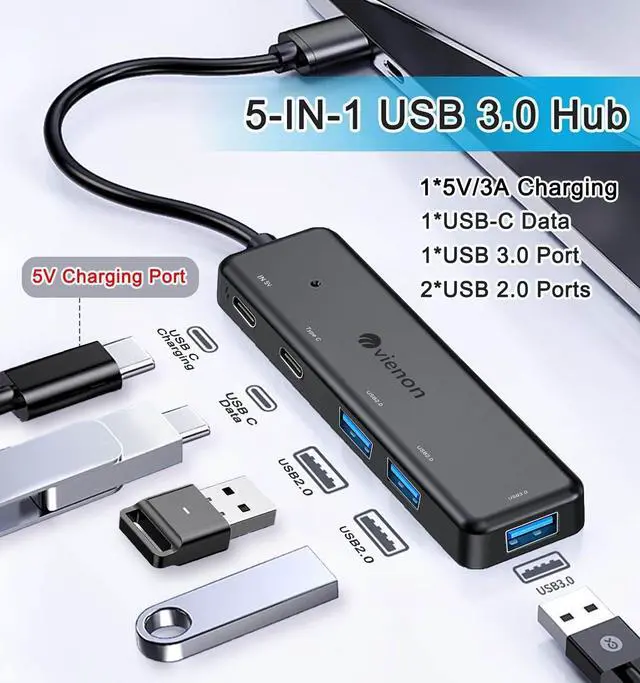 VIENON 5-Port Powered USB 3.0 Hub, USB Extender USB Splitter with 1 x USB 3.0, 2 x USB 2.0, 1 x USB C Power Port and 1 x USB C Data Port, USB Extender for A Port Laptop, PC, PS4/5, Xbox, Car and More