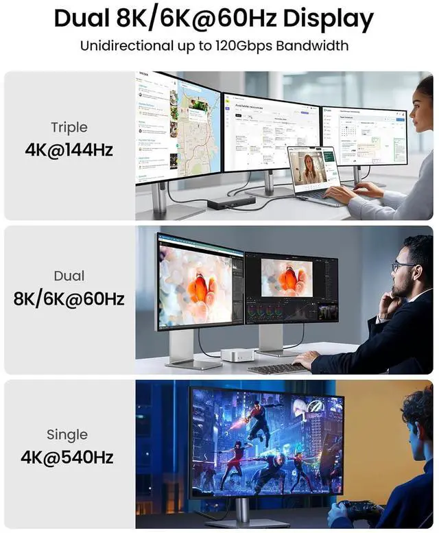 120Gbps Immersive Multi-Display: Unlock dual 8K/6K@60Hz, triple 4K@144Hz, or single 4K@540Hz with 120Gbps unidirectional bandwidth for ultra-smooth gaming, editing, and multitasking. Perfect for graphic designers and gamers seeking stunning clarity.