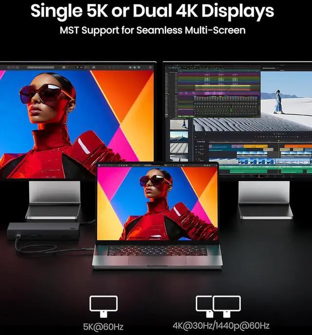 5K@60Hz/4K@144Hz Video outputSeamlessly connects USB-C laptops to USB-C displays. Supports single 8K@30Hz or 5K@60Hz, or dual 4K@30Hz and 1440p@60Hz displays, ideal for office applications or home theater. (Note: Requires DP Alt Mode support on devices)