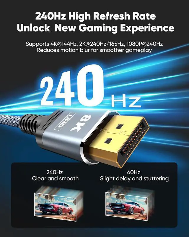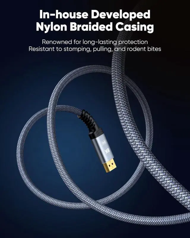 Multi-functional Support: The 8K DisplayPort cable supports video resolutions up to 8K@60Hz and transmits HD audio and video from computer to display, ideal for video streaming and gaming. It is also backward compatible with DP 1.3/1.2/1.1