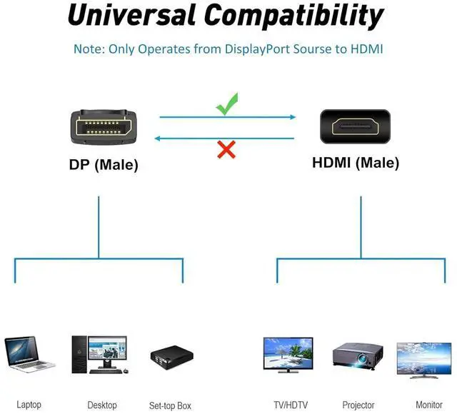 Uni-directional Transmission: 4K DisplayPort to HDMI cable is a Uni-Directional cord. The Display Port is connected to the Laptop, Desktop; HDMI is connected to the Monitor, HDTV, Projector. NOT COMPATIBLE with Hub Converter, Docking Station, Mac, PSP, Switch, Xbox.