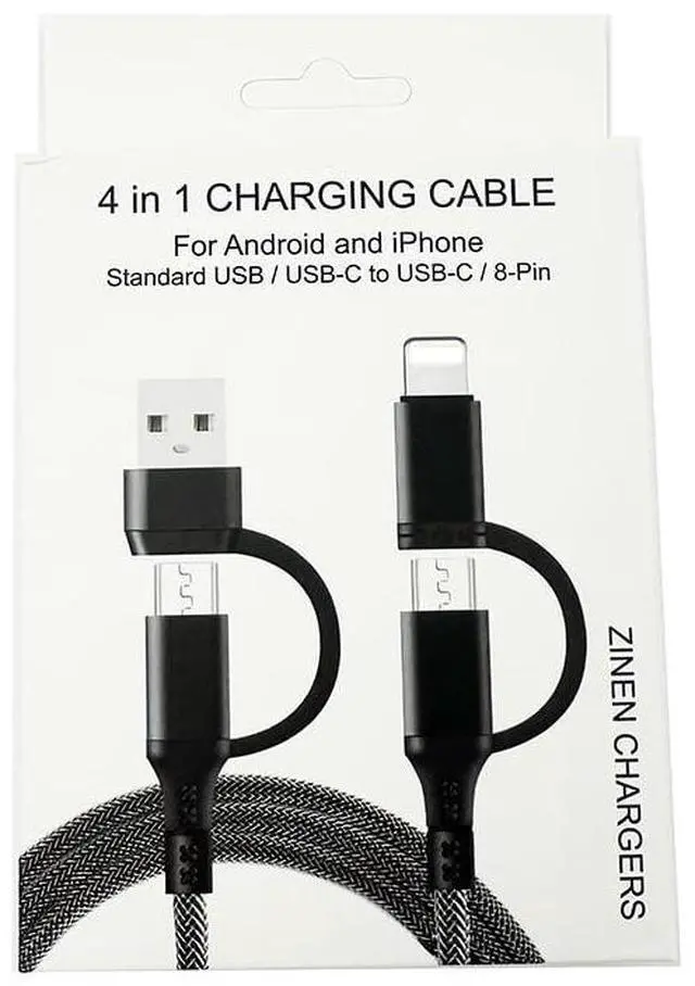 Your Device, Your Choice: This 4-in-1 cable offers four versatile connectors: USB-C to 8-Pin, USB-C to USB-C, USB to 8-Pin, and USB to USB-C, providing charging solutions for Android and iPhone devices. Note: Only one device can be charged at a time.