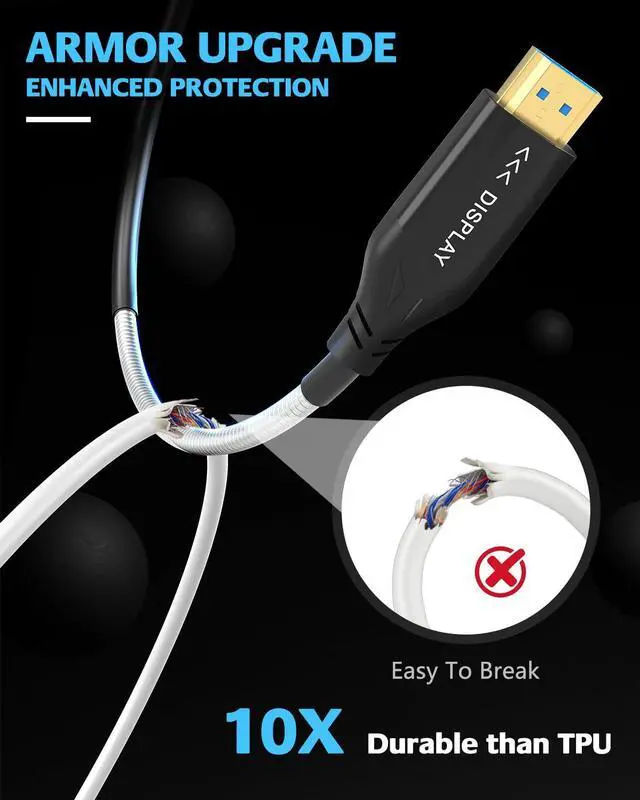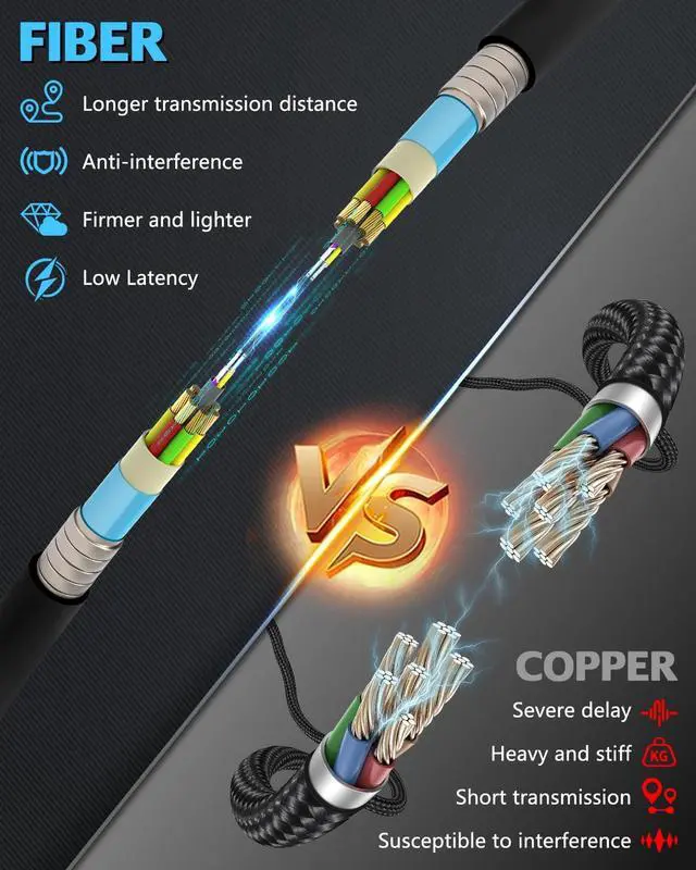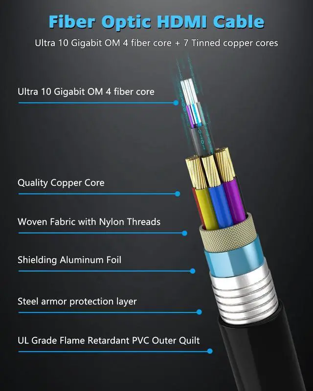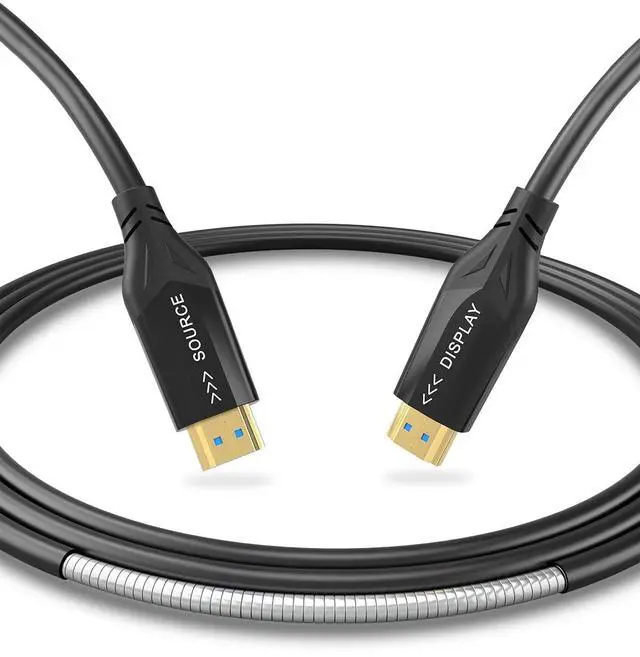 • Upgraded Armor Metal Fibre Optic HDMI Cable: 8k fiber optic HDMI cable adopts a special armored structure with a strong protective layer wrapped around the outside, which has a high strength resistance to pulling and compression. Whether in a complex wiring environment, or by accidental extrusion, pulling, can ensure the safety of the cable, not easy to damage, longer service life. The armor layer can also effectively shield the external electromagnetic interference, to ensure the lossless transmission of photoelectric signals, so that you can get stable, clear images and sound in a variety of environments.