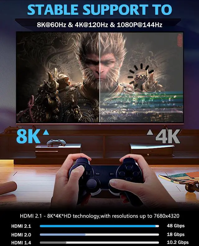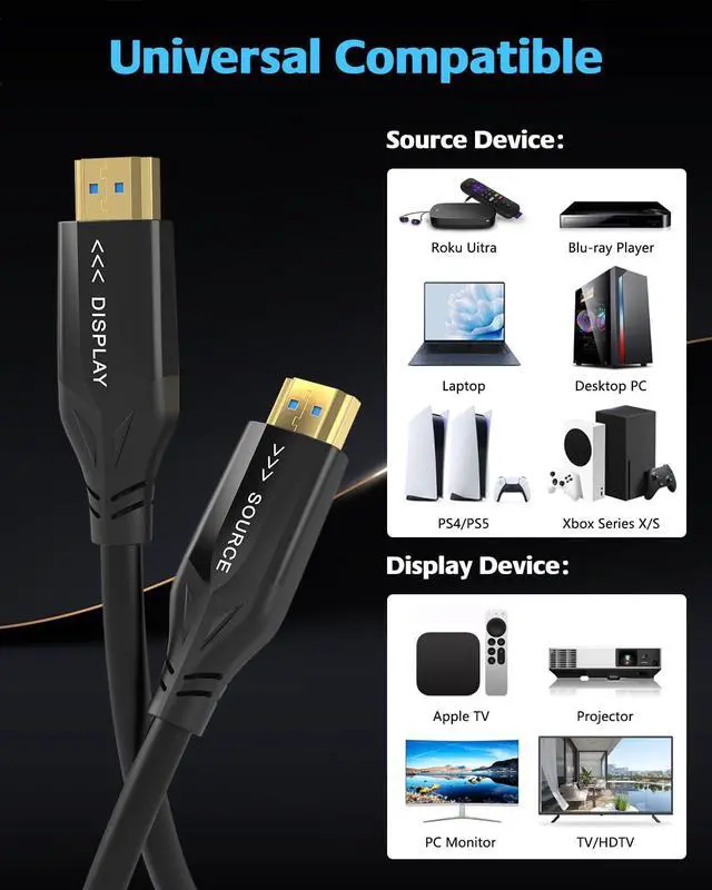 Wide compatibility:8k 48Gbps fiber optic HDMI cable perfectly compatible with all kinds of devices that support HDMI 2.1 interface, such as PC, NVI DIA SHI ELD TV, Apple TV, Sony, Samsung, LG Oled TV, CD/DVD/Blu ray player, AV receiver, TV box, projector, monitor, PS5, PS4 Pro, PS3, Roku, Nin tendo Switch, Xbox 360, Xbox One X/S, laptop and more.