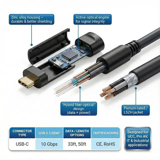 This engineered fiber optic USBC to USBC active optical cable is shown in a clear exploded view, highlighting its zincalloy connector housing for durability and shielding, active optical engine for signal integrity. A concise spec table summarizes USB 3.2 Gen 2 10 Gbps performance, USBC male to male connectors, data / video / PD support, available lengths, and broad device compatibility. Certifications such as CE, FCC, RoHS and a 2year limited service provide strong proof of reliability for UCC, Pro AV, IT and industrial projects.