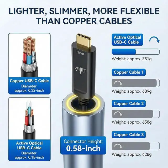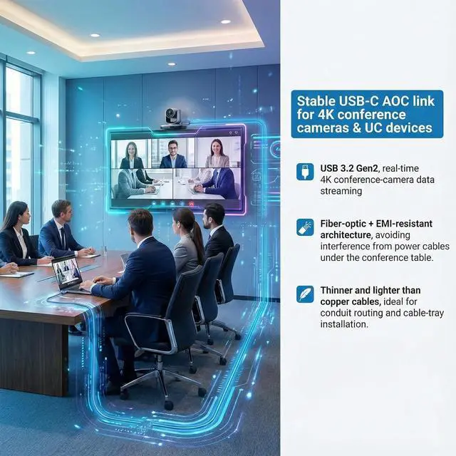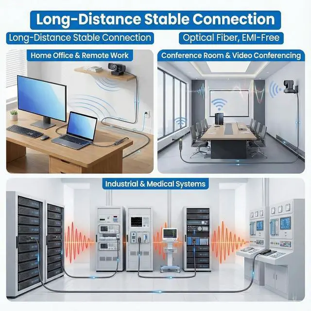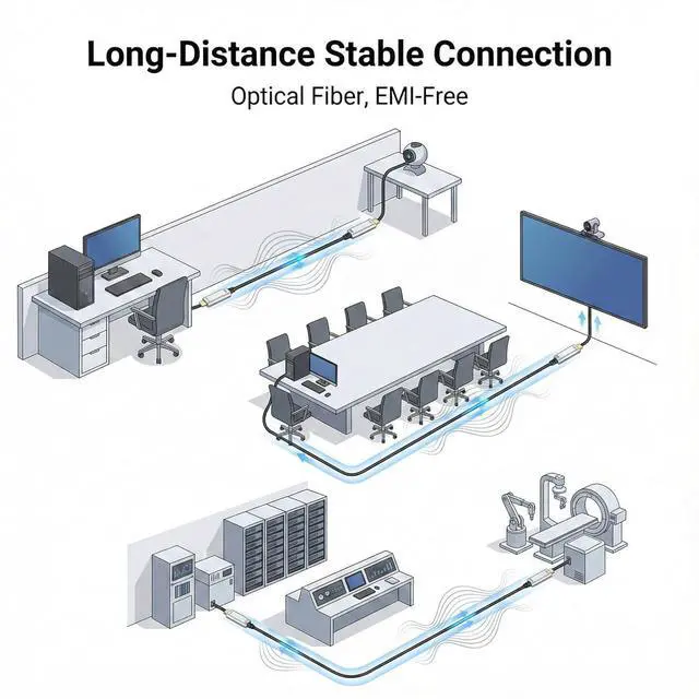 For machine vision cameras, this fiber optic USB C to USB C active optical cable delivers stable 10 Gbps bandwidth for continuous highresolution image streams over longer distances than passive USB.