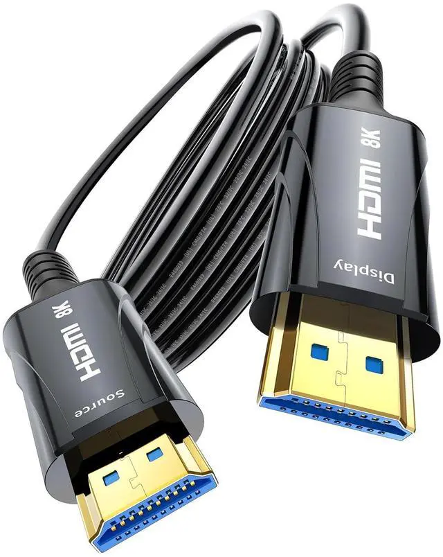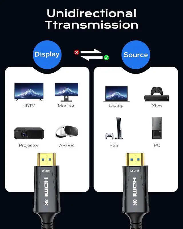 Unidirectional Design Note the Connection - This 8k Fiber Optic HDMI Cable features a one-way transmission. Ensure the "SOURCE" end connects to your device (laptop, Blu-ray player, etc.) and the "DISPLAY" end to your monitor/TV/projector. Incorrect placement will result in no signal.