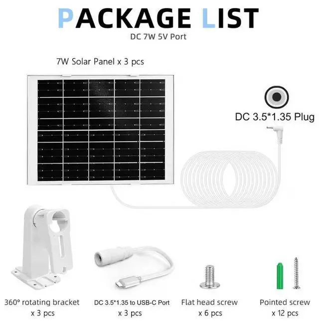 5.Package IncludesIncludes 3 Ring solar panels, 3 10ft USB-C cables, 3 USB-C to DC plug adapter cables, 3 360° mounting brackets, 3 screw packs. Our friendly customer service is always ready to assist you for satisfaction.