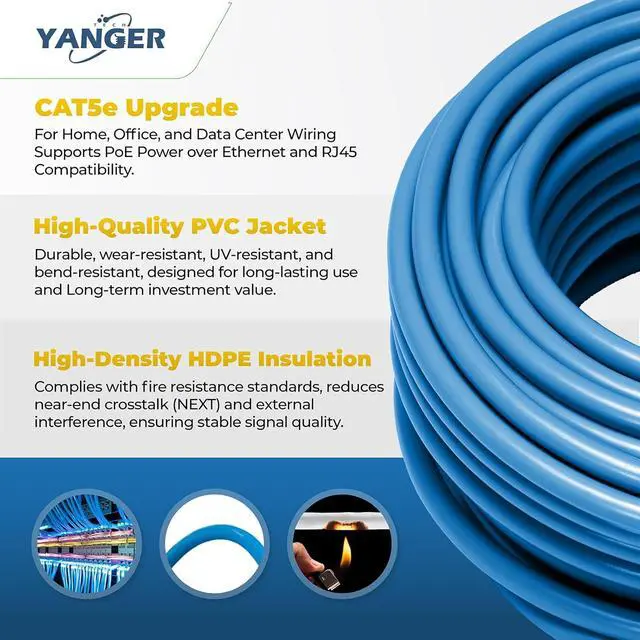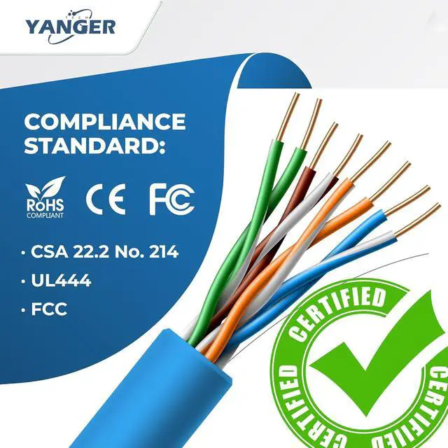 Certified for Quality and Compliance - Our cable meets recognized safety and compliance standards, including FCC, UL444, CE, ROHS, and CSA 22.2 No. 214. It is also compliant with CAT5e standards (TIA/EIA-568-B.2) and ISO/IEC 11801 standards for enterprise wiring, ensuring safe and worry-free in-wall installations.