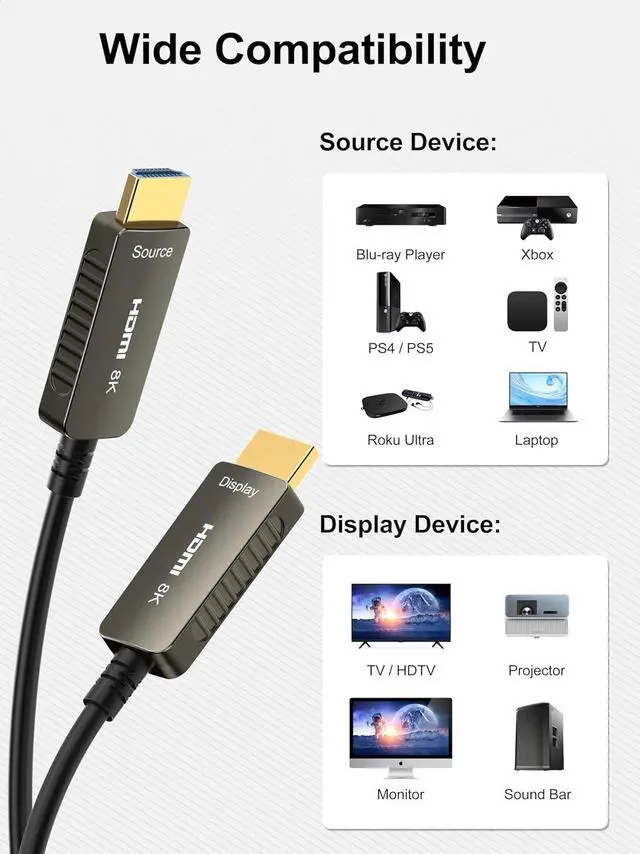 8K HDMI Fiber Optic CableOur 8K HDMI Fiber Optic cable is ultra high speed 48Gbps bandwidth (2.5× faster than HDMI 2.0), supporting 8K resolution, Dynamic HDR, and seamless 4K@120Hz playback. Universally compatible with PlayStation 5/4/3, Xbox Series X/S, Nintendo Switch, 8K/4K TVs, PCs, Blu-ray players, projectors, and more.
