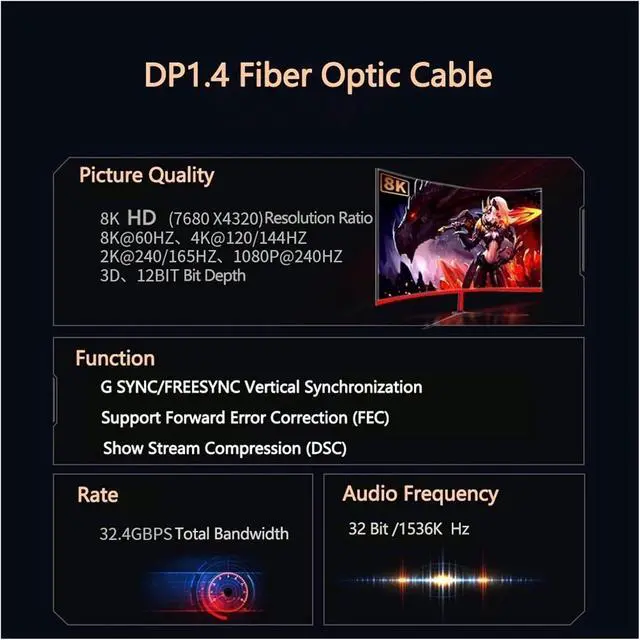 Ultra HD Resolution Displayport Cable 1.4: Angusplay 8K Displayport Cable supports high resolutions 8K (7680x4320) 60Hz, 5K (5120x2880) 60Hz, 4K (3840x2160) 60Hz /120Hz / 144Hz, 2K (1080P / 1440P) 120Hz / 165Hz / 240Hz. Supports Dynamic HDR and HDCP 2.2. Backwards compatible with Display Port 1.3, 1.2, 1.2a, 1.1 and 1.0. Support flawless audio pass-through for uncompressed digital audio channels at 7.1, 5.1 and 2.0