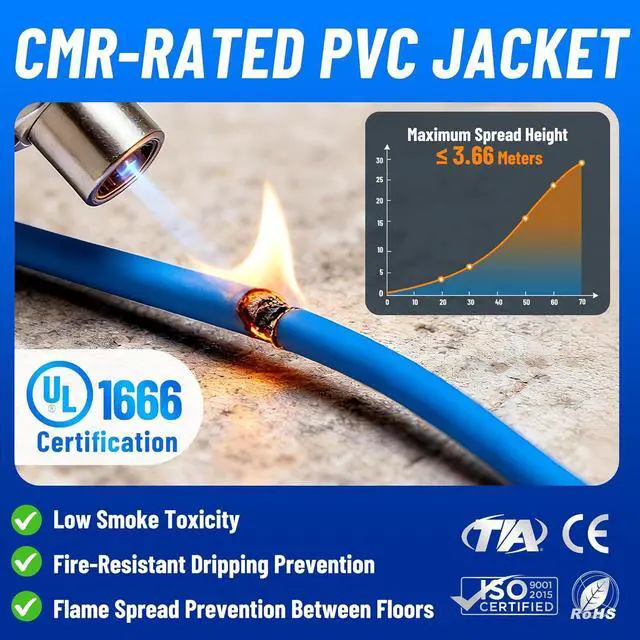 [CMR GRADE FLAME-RETARDANT JACKET] Our cat6 Network cable features a CMR-rated flame-retardant jacket, making it safe for indoor use in walls, ceilings, and riser shafts. Its flame-retardant properties effectively inhibit the spread of fire in vertical installations, such as between floors