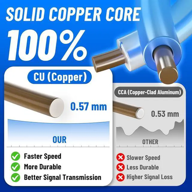 [SUPERIOR PERFORMANCE] Compared to Copper-Clad Aluminum (CCA), our network cable offers superior signal strength, conductivity, flexibility and durability. Each spool undergoes rigorous Fluke testing, UL certified and complies with CE, RoHS, ISO, TIA