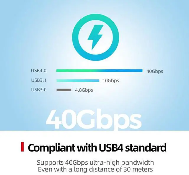 How high! Up to USB4 40Gbps standard bandwidthAccording to USB4.0 standard, the theoretical bandwidth is as high as 40Gbps, even if the bandwidth is 10 meters long.