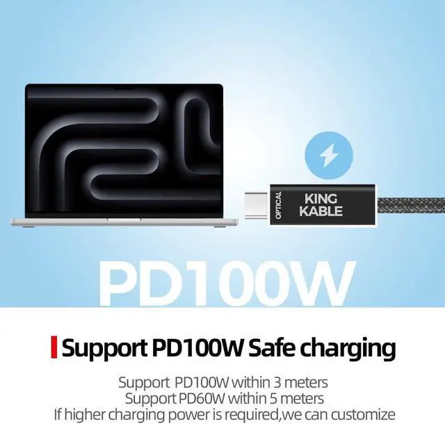 How fast !Support PD100W efficient fast chargingDue to the slender and flexible design of the cable, this cable supports PD100W within 3m (inclusive) and PD60W within 5m (inclusive). If higher charging power is required, the cable can be customized.