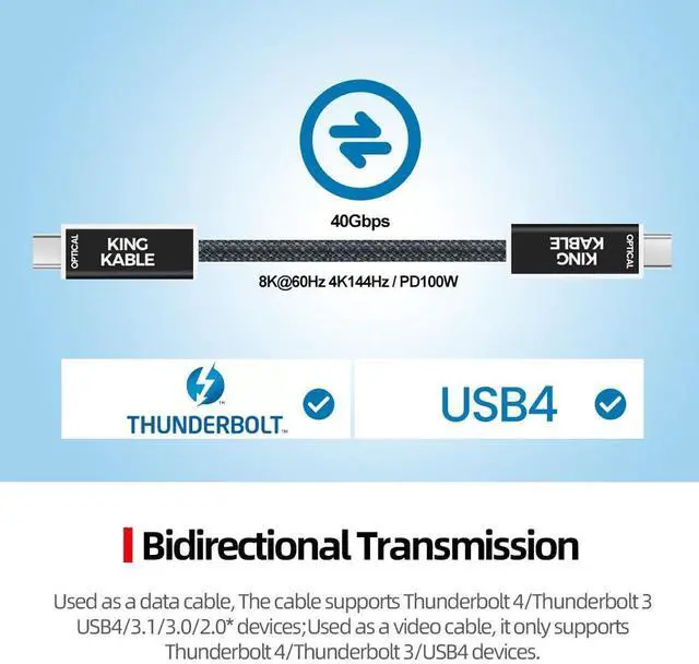 How convenient!Bidirectional transmission regardless of directionUsed as a data line, the Thunderbolt 4/ Thunderbolt 3/USB4/3.1/3.0/2.0* version is supported as a video line, and only Thunderbolt 4/ Thunderbolt 3/USB4 version supports USB2.0 within *5 meters (inclusive); PD100W/5 within 3m (inclusive)/PD60W within 5m (inclusive).