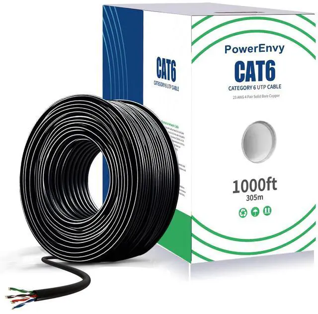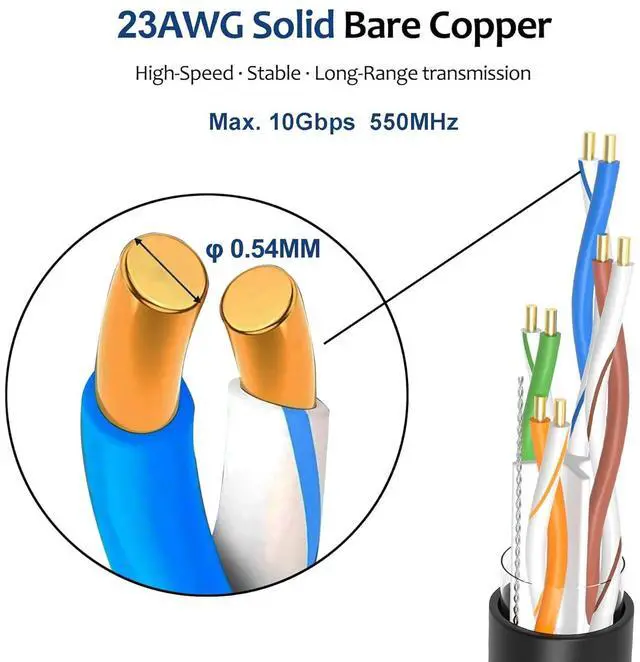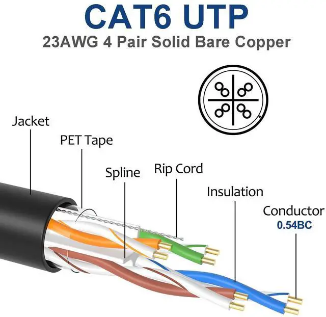 Cat6 Solid Bare Copper 23AWG UTP PerformanceEngineered for residential and high-performance commercial and professional networking, this Cat6 Ethernet cable features 23 AWG solid bare copper conductors with four unshielded twisted pairs (UTP) for superior signal integrity and minimal interference. With a 550MHz bandwidth and speeds up to 10Gbps, its ideal for high-speed data centers, offices, and enterprise-grade installations requiring dependable, long-distance connections.