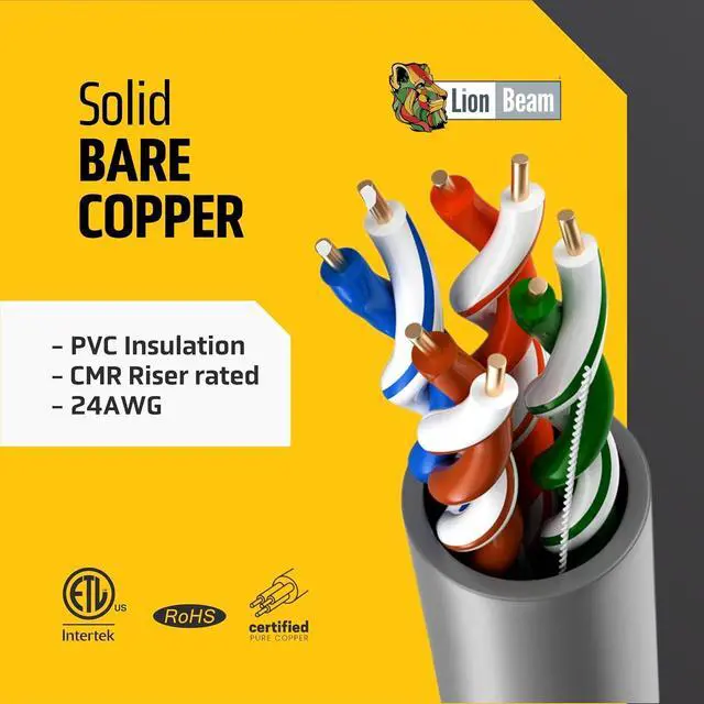 Pure Solid Bare Copper 24 AWG Ethernet Cable Cat 5 Unlike CCA alternatives, this Ethernet cable cat 5e 1000ft is made from 4 twisted pairs of pure solid bare copper wires with 8 conductors, offering maximum conductivity and low signal loss. Reinforced with a durable PVC CMR riser-rated jacket, this Cat 5 cable spool provides reliable long-term performance, making it the perfect Ethernet wire for structured cabling, patch panels, and keystone jacks.