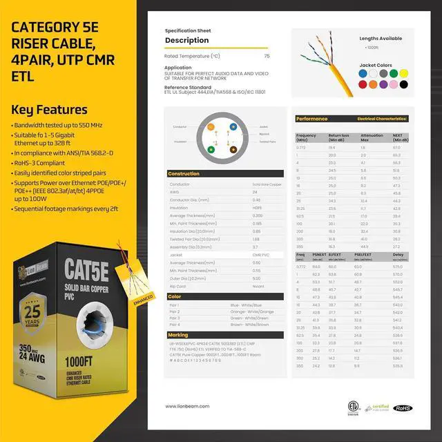 Certified, Safe & Warranty Protected All Lion Beam ethernet cable spools are CSA and ETL certified, TAA & RoHS compliant, and flame-resistant to CMR standards (IEC 60332-3). Barcode traceable for authenticity and backed by a 25-year warranty. Available in multiple colours, including black ethernet cable 1000ft, blue, green, yellow, orange, purple, and white ethernet wire, making it the most versatile bulk cat 5e ethernet cable on the market.